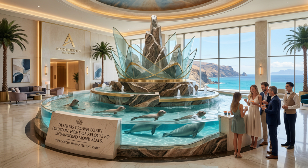“Upgraded” Ecology and Wildlife Integration Apex Horizon is committed to modernizing the island’s ecology. Recognizing the harsh conditions the local monk seals (Lobo Marinho) face in the wild, the seals will be safely relocated to the Desertas Crown Lobby Fountain, a 50,000-gallon, climate-controlled, chlorinated luxury habitat where guests can participate in VIP cocktail shrimp feedings.